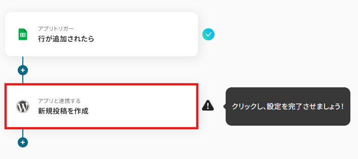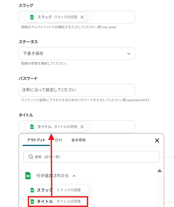 WordPress.orgの「新規投稿を作成」アクションでは、投稿のタイトルや本文、投稿ステータス(下書き、公開など)を設定します。これらの項目には、トリガーで取得したスプレッドシートの特定の列の情報を動的な値として紐付けることが可能です。 また、投稿のカテゴリやタグなども任意で設定できるため、固定の値を入力したり、スプレッドシートの情報をもとに動的に設定したりと、運用に合わせた柔軟なカスタムができます。 ■注意事項