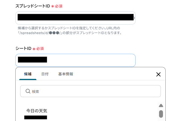 5.「スプレッドシートID」、「シートID」は候補から選択してください。
