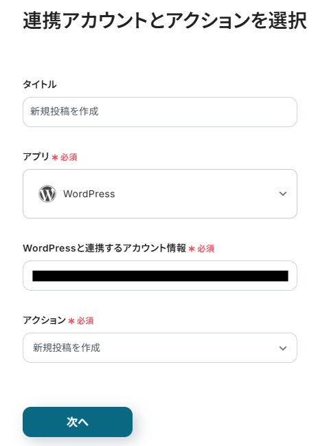 「タイトル」→自由に変更可能 「アプリ」→WordPress.org 「WordPress.orgと連携するアカウント情報」→アカウントに相違がないか確認 「アクション」→新規投稿を作成