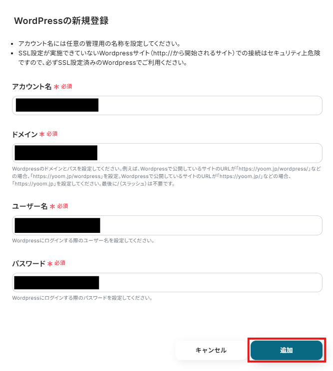 以下の画面で、必須項目を入力し、「追加」をクリックします。