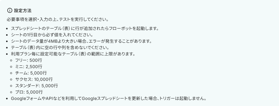 今回は「Google スプレッドシートで行が追加されたら、WordPress.orgに下書きを作成する」フローボットを作成していきます! 作成成の流れは、大きく分けて以下のプロセスに沿って進めます。