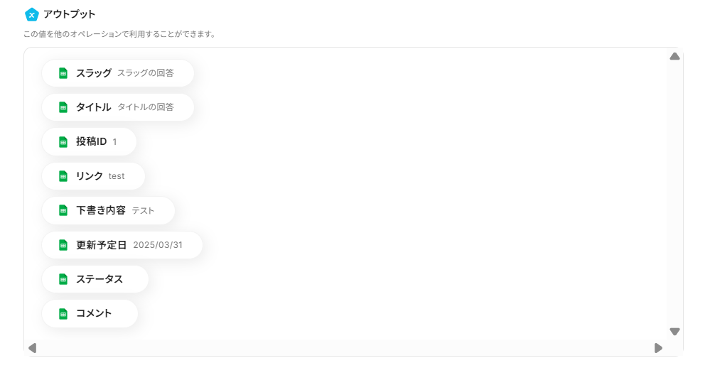 WordPress.orgで新規投稿を作成する際に、Google スプレッドシートの各列から取得したデータを、投稿のタイトルや本文に動的な値として設定できます。 上記に加えて、特定のカテゴリやタグ、定型文などを固定値として設定することも可能です。 ■注意事項