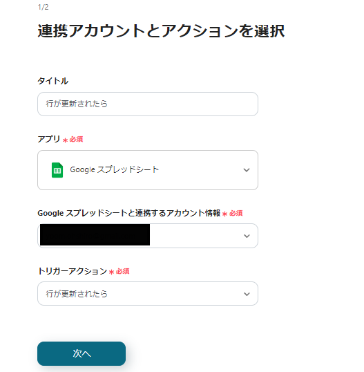 まずは最初のアプリトリガー「行が更新されたら」をクリックしてください。