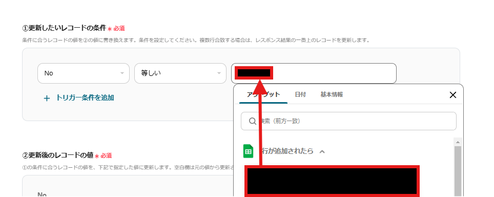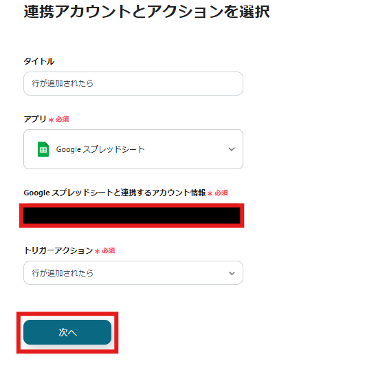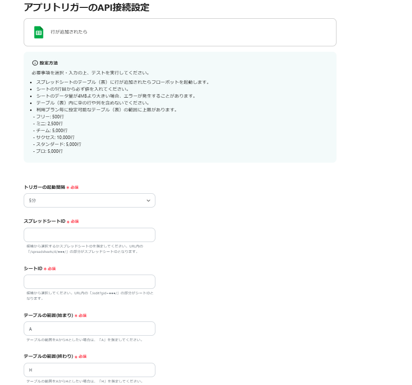 今回行の追加を検知するスプレッドシートの情報を入力する画面が表示されます。