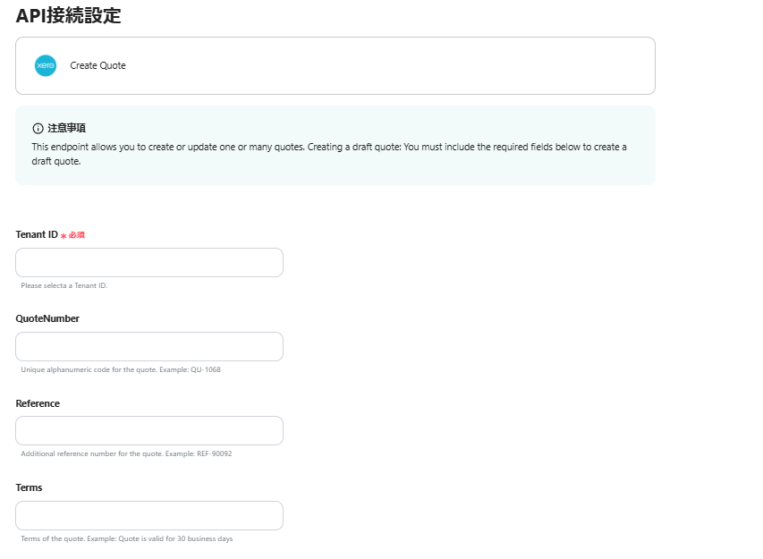 Xeroの提供するAPIを用いてXeroの指定のチャンネルにGoogle スプレッドシートで登録された情報をもとに見積書を作成することで実現が可能です。