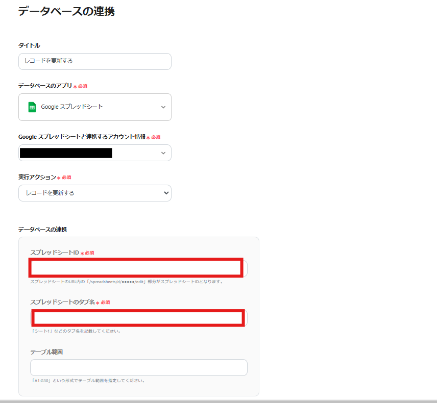 「※必須」の項目を注釈にあるようにスプレッドシートの情報を入力しましょう。
