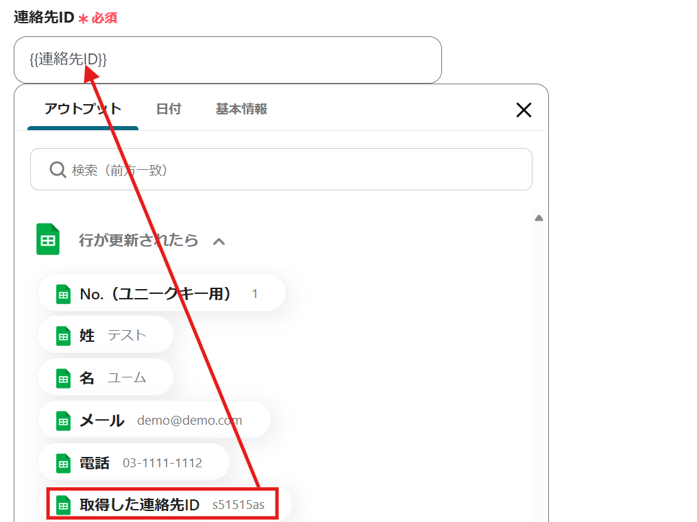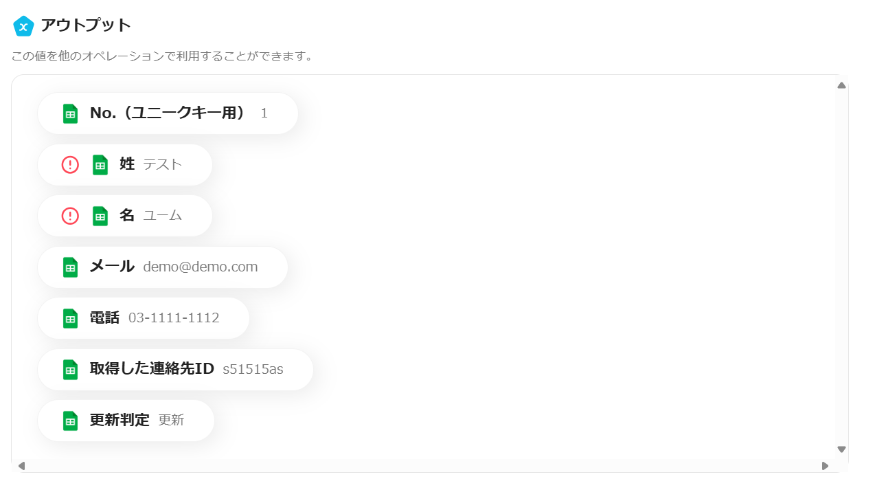 アウトプットに、Google スプレッドシートのレコード情報が反映したら保存します。