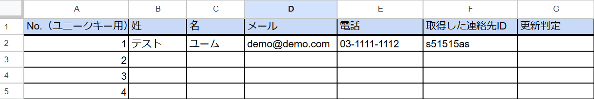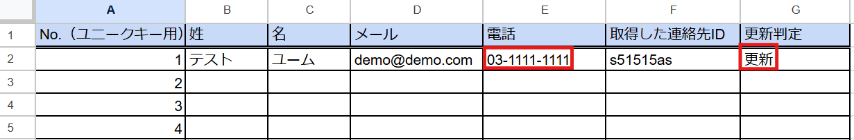 今回は電話番号を変更し、更新判定欄に更新と入力しました。