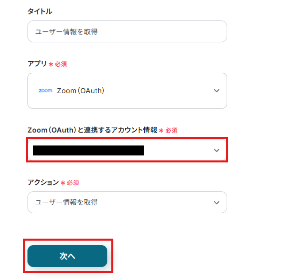 (2)「Zoomと連携するアカウント情報」で連携したZoomのアカウント情報を選択し、「次へ」をクリックします。