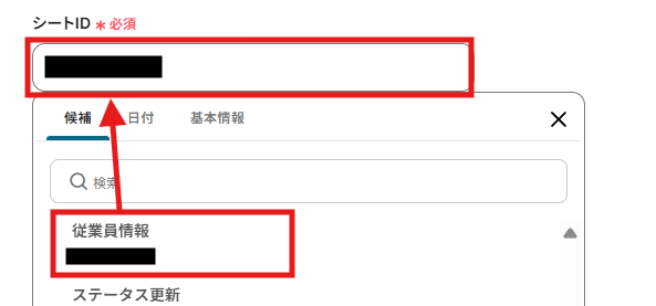 「候補」からスプレッドシートのリストが表示されます。スプレッドシート名をクリックするとスプレッドシートIDが自動で入力されるので、対象のものを選択しましょう。