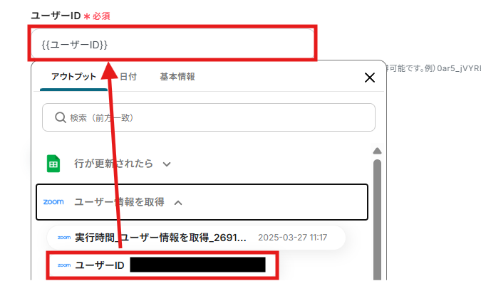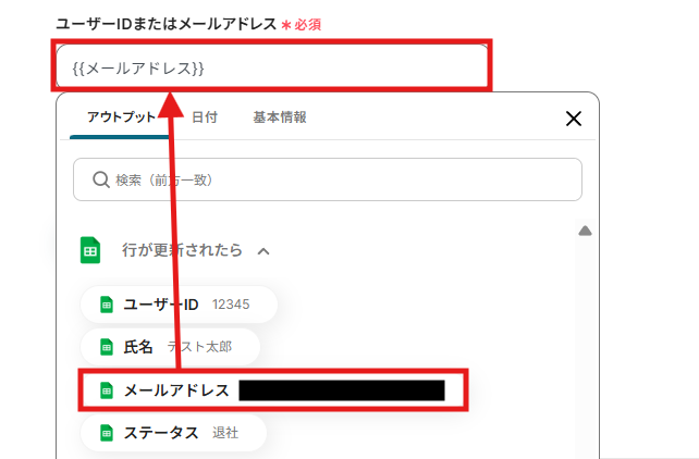 「アウトプット」の「行が更新されたら」から、ユーザーIDやメールアドレスを引用することも可能です。