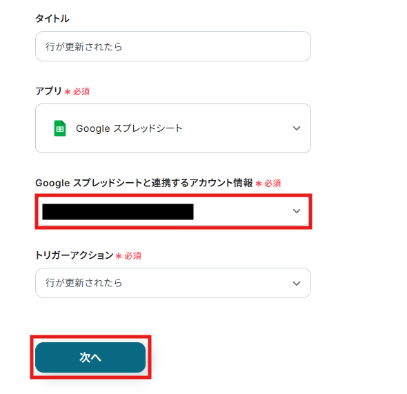 (2)「Googleスプレッドシートと連携するアカウント情報」で対象のGoogleスプレッドシートのアカウント情報を選択し、「次へ」をクリックします。
