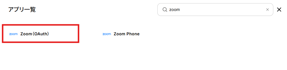 1.「Zoom」と検索し、アプリ一覧からZoom(OAuth)を選択します。