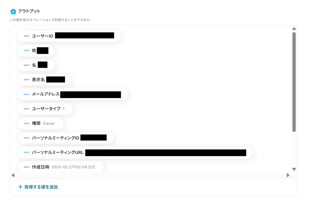 (4)テストを実行し、「アウトプット」にZoomに登録されたユーザー情報が抽出されているか確認します。