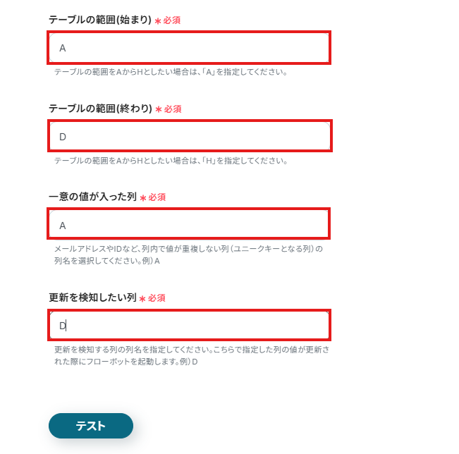 (8)指定した列(=D列)を更新した後に「テスト」をクリックしてください。