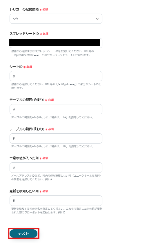 すべての項目を入力したら「テスト」をクリックして、エラーの有無を確認しましょう。