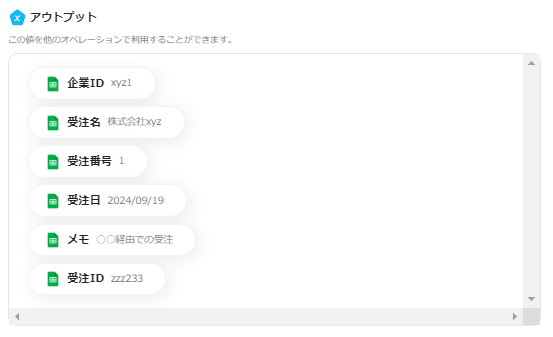 テストが成功すると、指定したGoogleスプレッドシートの項目がアウトプットとして反映されます。