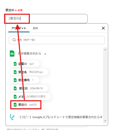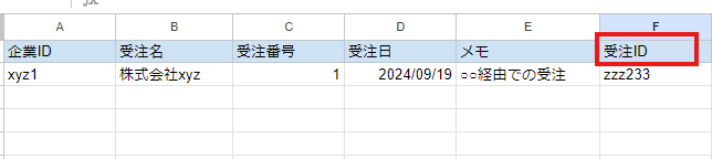 「受注ID」はステップ2で受注情報を更新する際に必ず必要な情報です。下記画像のように、あらかじめGoogleスプレッドシート内に情報を格納してください。