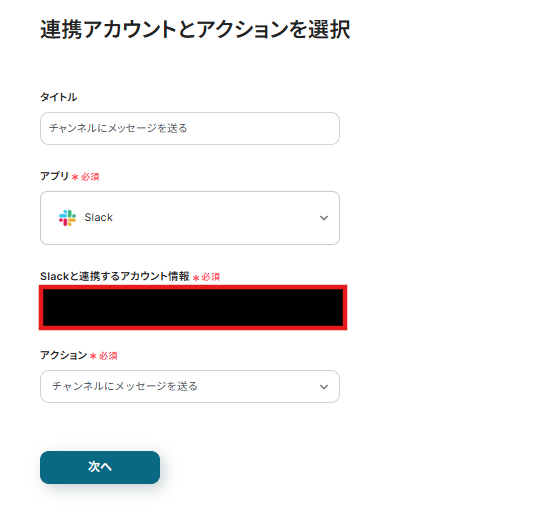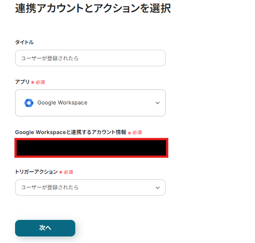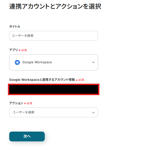 連携アカウントとアクションを選択する画面が表示されるので、今回連携するGoogle Workspaceのアカウントを確認し「次へ」をクリックします。