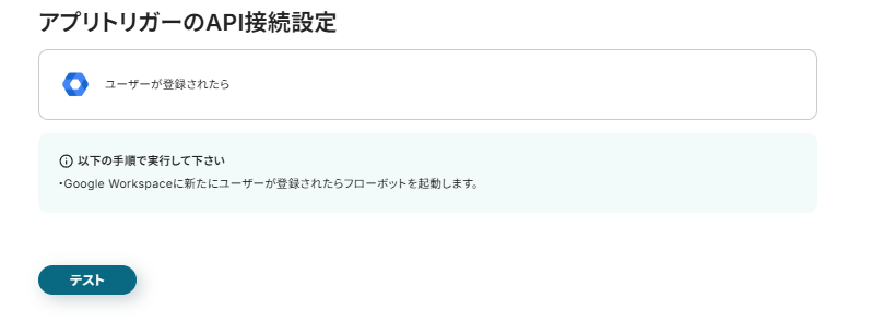 以下の画面が表示されるので、Google Workspace で実際に新しいユーザーを作成し、「テスト」をクリックしましょう。