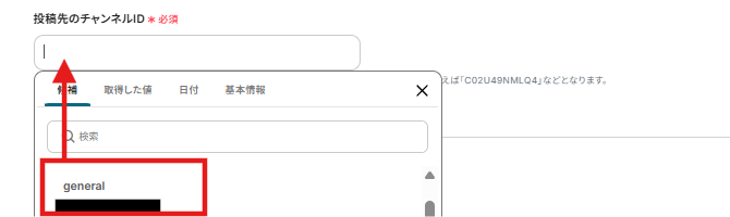 Slackの投稿先のチャンネルIDを表示される候補から選択しましょう。