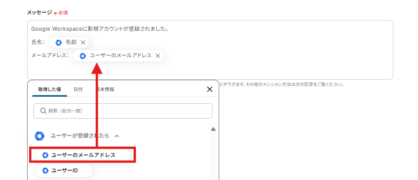 ここではユーザー情報が分かりやすいように、「氏名」「メールアドレス」を「取得した値」から選択し、入力しました。