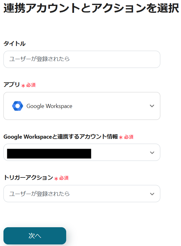 3.Google Workspaceと連携するアカウントを確認し、「次へ」をクリックします。