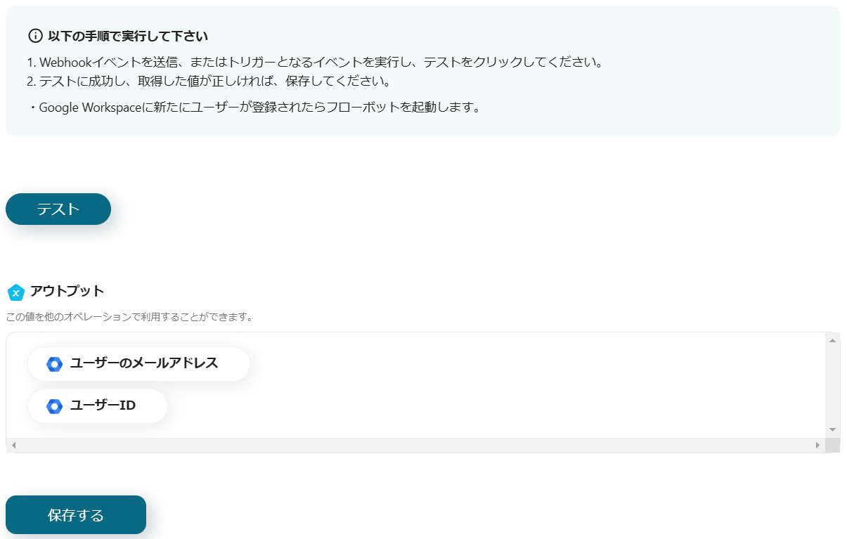 5.次の画面でも「テスト」をクリックし成功すると、アウトプットにGoogle Workspaceから取得した情報が表示されます。