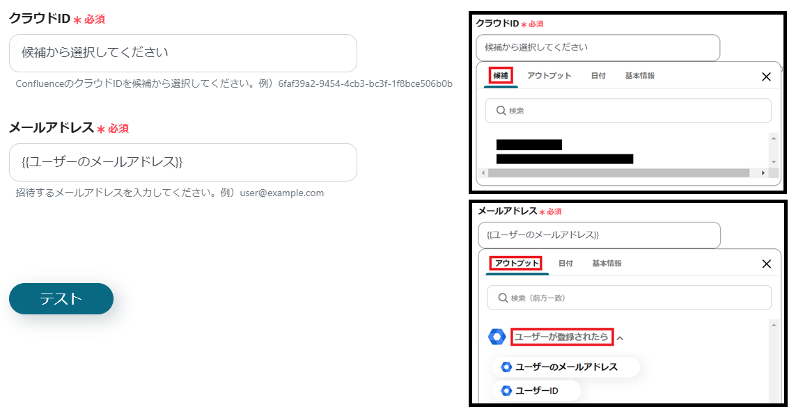3.クラウドID、メールアドレスを設定し、「テスト」をクリックします。