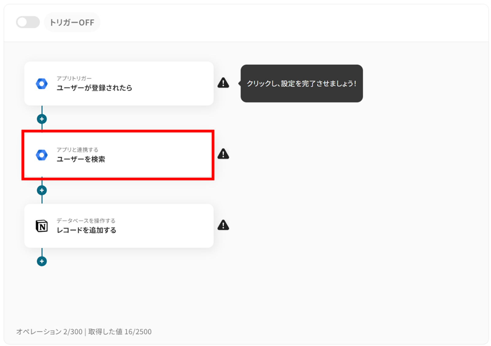 【Tips】 このようにアウトプットを活用することで、Google Workspaceの最新のデータに基づいてフローが起動し、Notionにユーザーを自動登録可能となります。なお、テキストを直接入力した部分は固定値とされるため、アウトプットを活用せず設定を行うと毎回同じユーザーデータが追加されてしまうので注意が必要です。