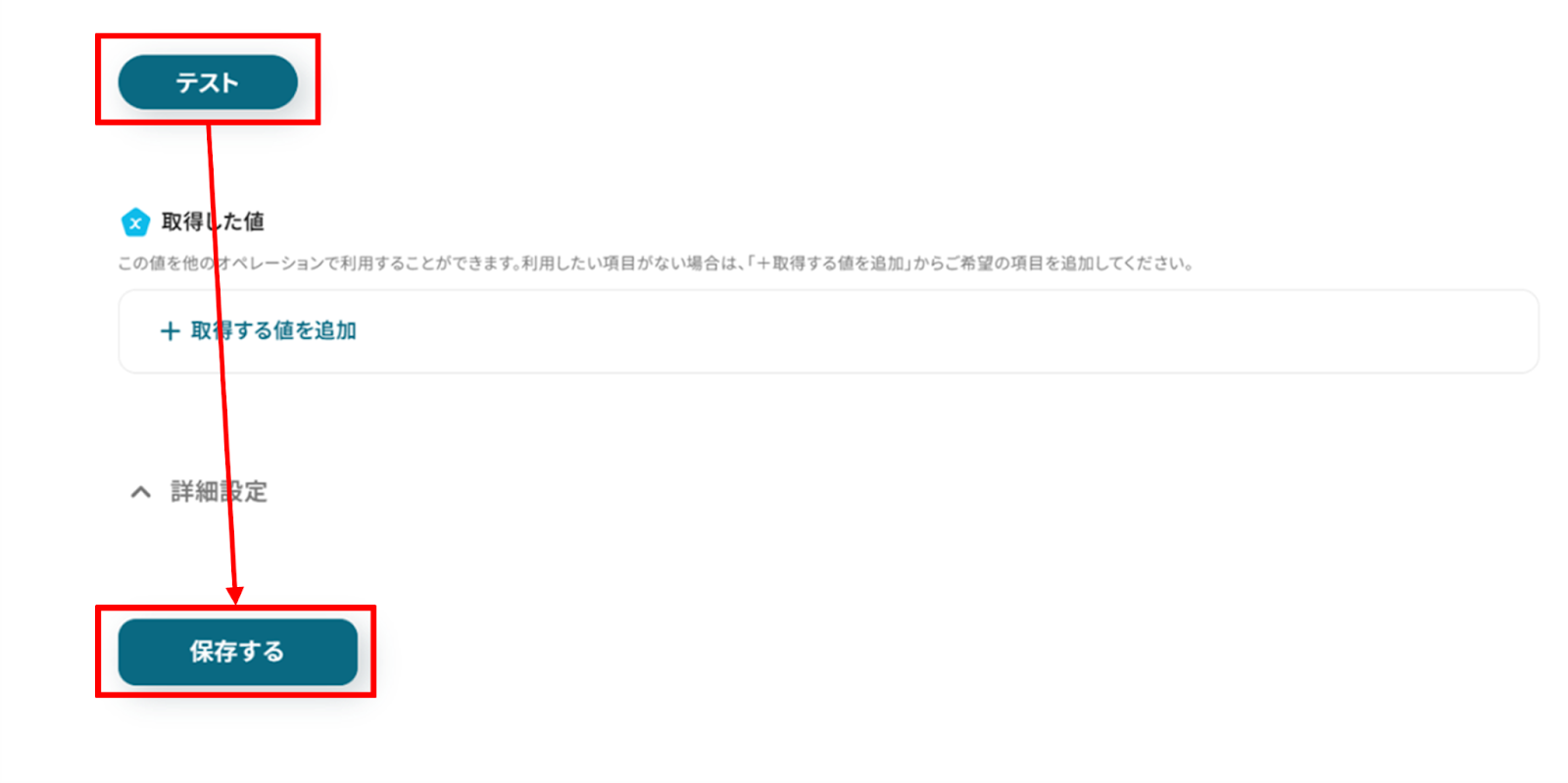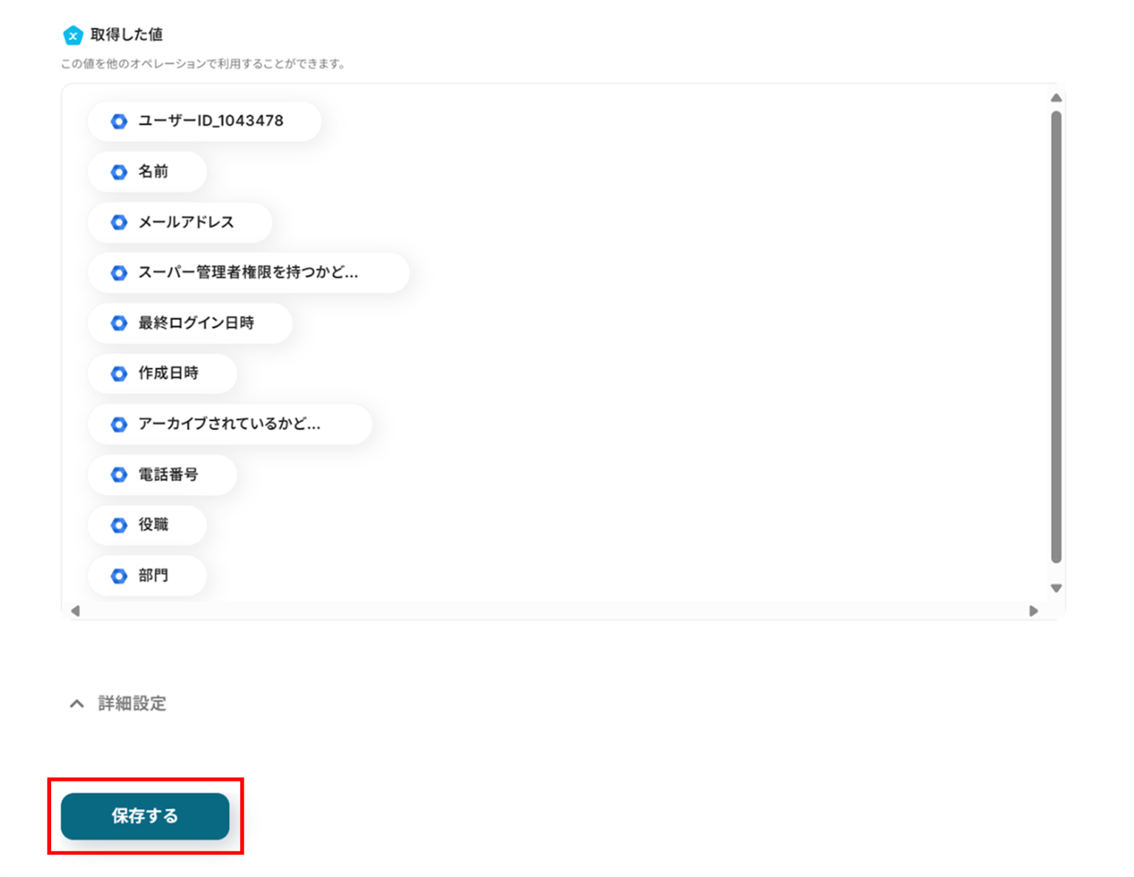 入力が終わったら、「テスト」をクリックしましょう。 テストに成功すると、取得した値にユーザー情報が追加されていました! 「保存する」をクリックして次の工程へ進みましょう。