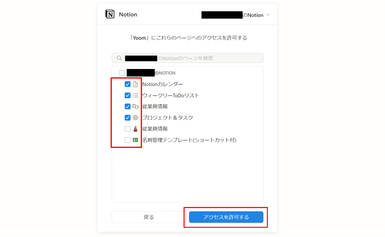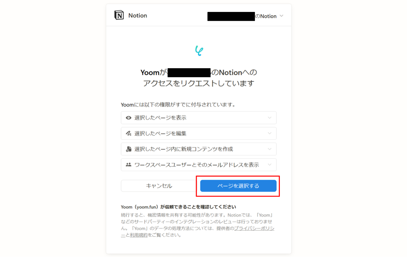 (3)次にNotionの連携を行います。同様にYoomの新規接続一覧からNotionをクリックします。 アクセスをリクエスト画像から、「ページを選択する」をクリックします。