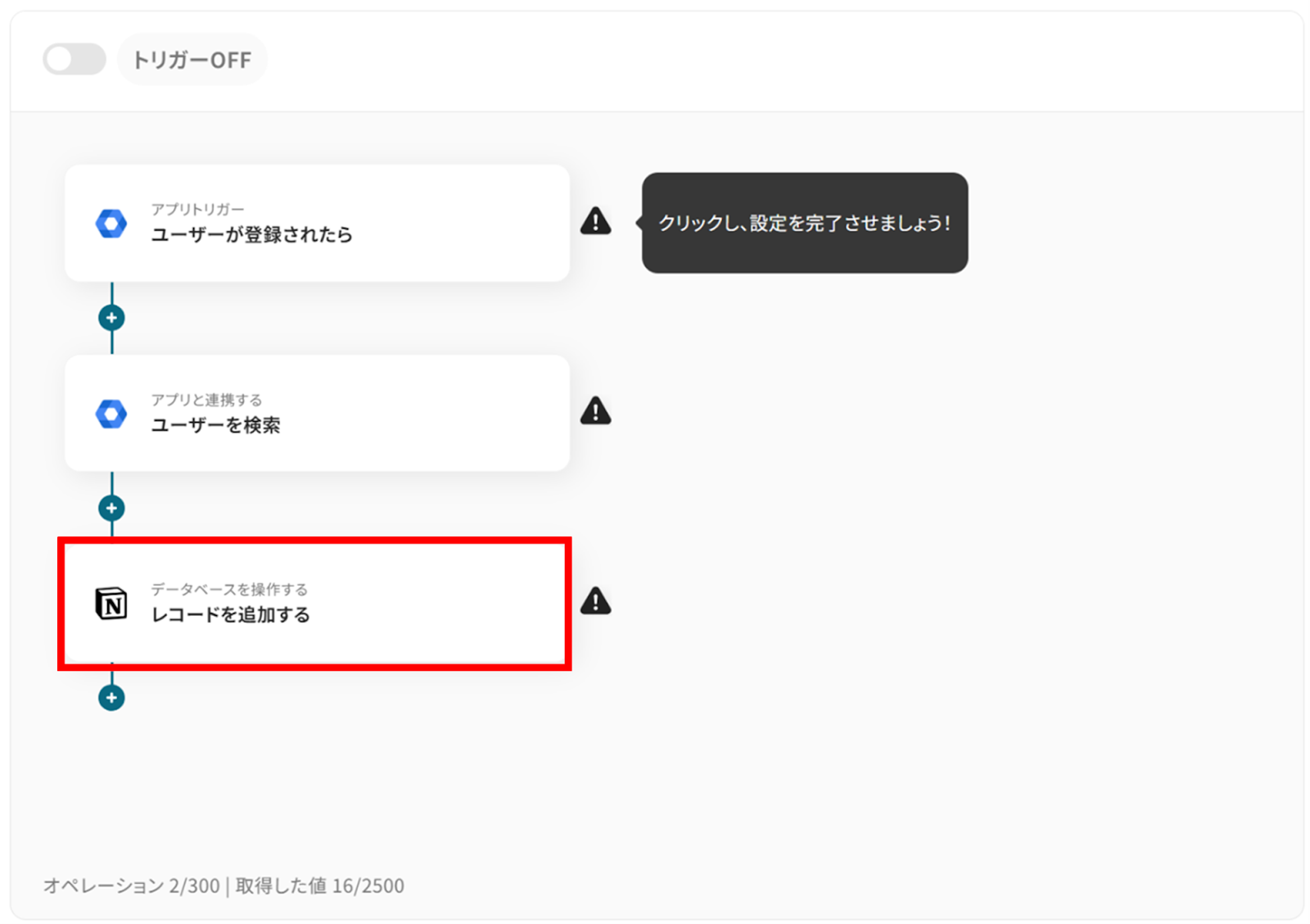 (1)次にNotionと連携してレコードを追加します! 「レコードを追加する」をクリックしましょう。これは、Google WorkspaceのデータをNotionに追加する設定となります。