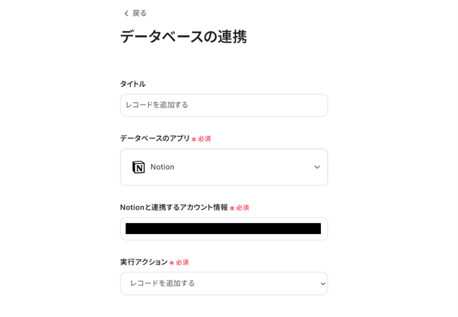 (2)「データベースの連携」画面から、Notionと連携するアカウント情報に誤りがないかを確認し、実行アクションは「レコードを追加する」のままにします。