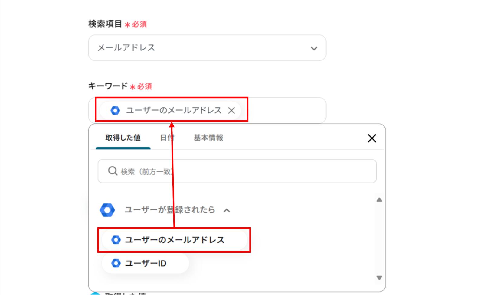 (3)「API接続設定」画面から、検索項目はプルダウンから選択します。キーワードには先ほど取得した値=アウトプットを使って入力することで都度変更することなくGoogle Workspaceの情報を引用することができます!