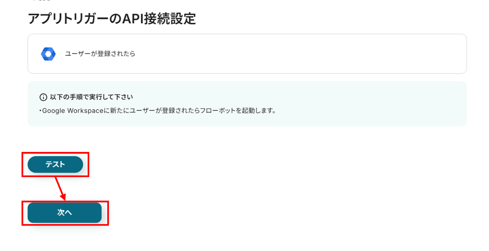 (3)「アプリトリガーのAPI接続設定」画面から、「テスト」をクリックする前にGoogle Workspaceにテスト用にユーザー登録をしておきましょう! 登録が終わったら「テスト」をクリックし、「次へ」をクリックします。
