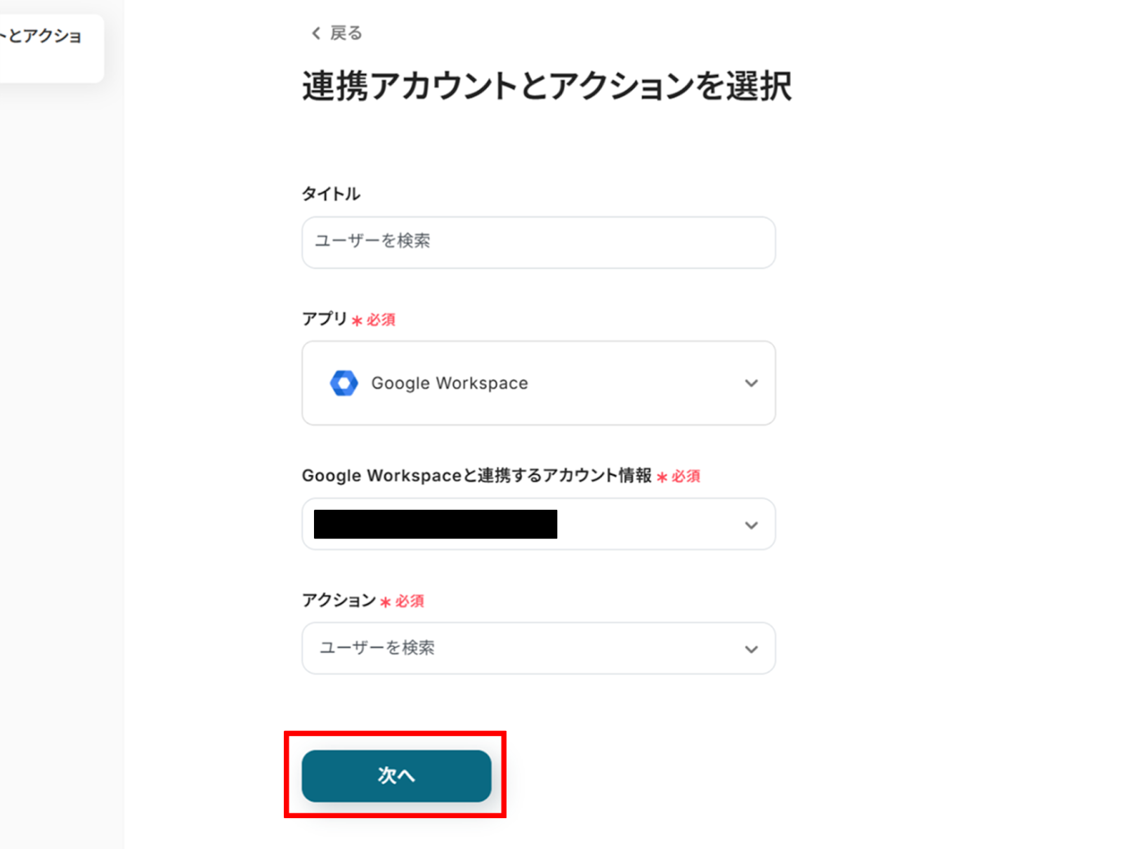 (2)「連携アカウントとアクションを選択」画面から、先ほどと同様にアカウント情報に誤りがないかを確認し、アクションは「ユーザーを検索」のままで「次へ」をクリックします。