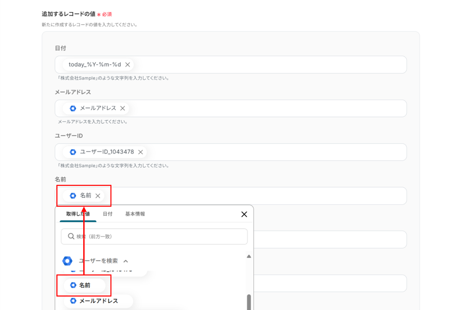 ・Google Workspaceから取得した名前データは、姓と名に分かれていないため、姓の欄に一括して反映する形になります。ただし、AIオペレーションの抽出機能を利用することで、名前を姓と名に分割できる場合があります。