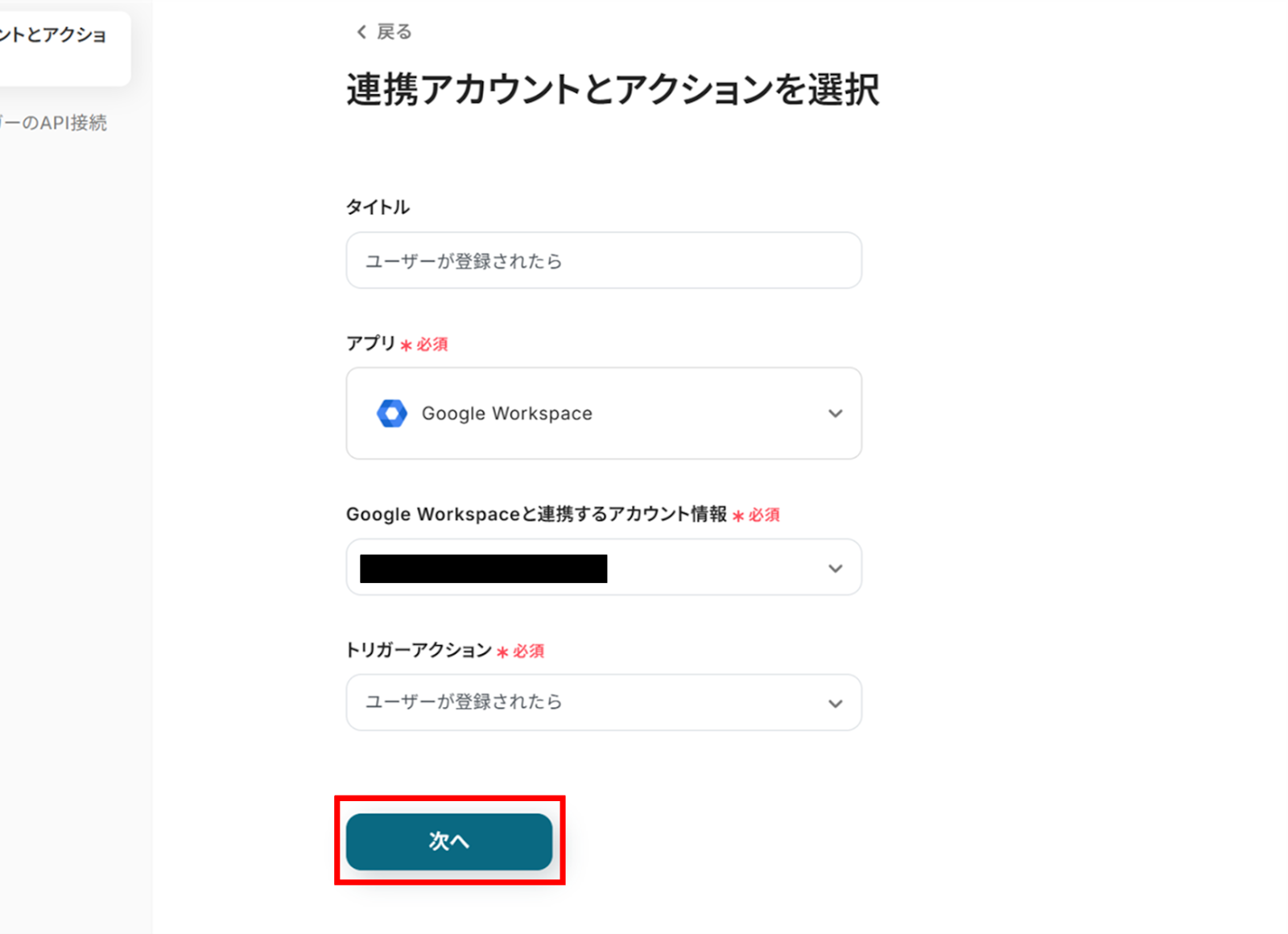 (2)「連携アカウントとアクションを選択」画面から、フローのタイトルは自由に変更することができます。 Google Workspaceと連携するアカウント情報に誤りがないかを確認し、トリガーアクションは「ユーザーが登録されたら」のままで「次へ」をクリックします。