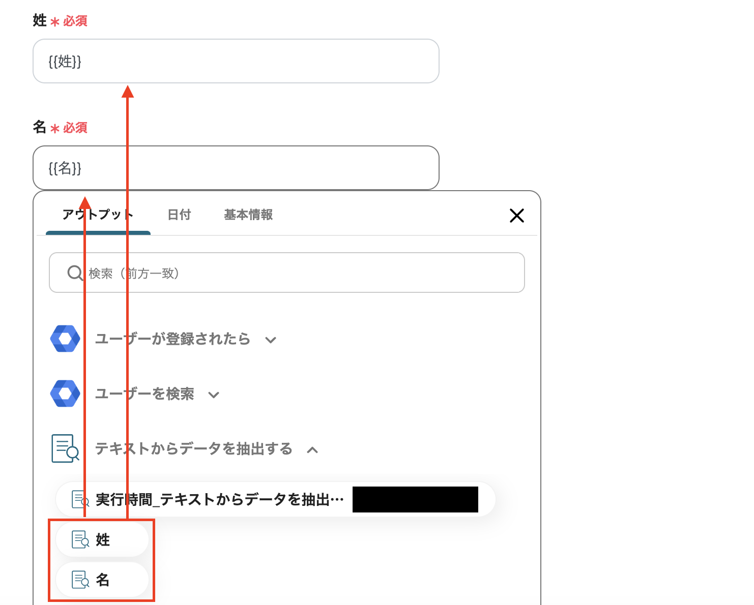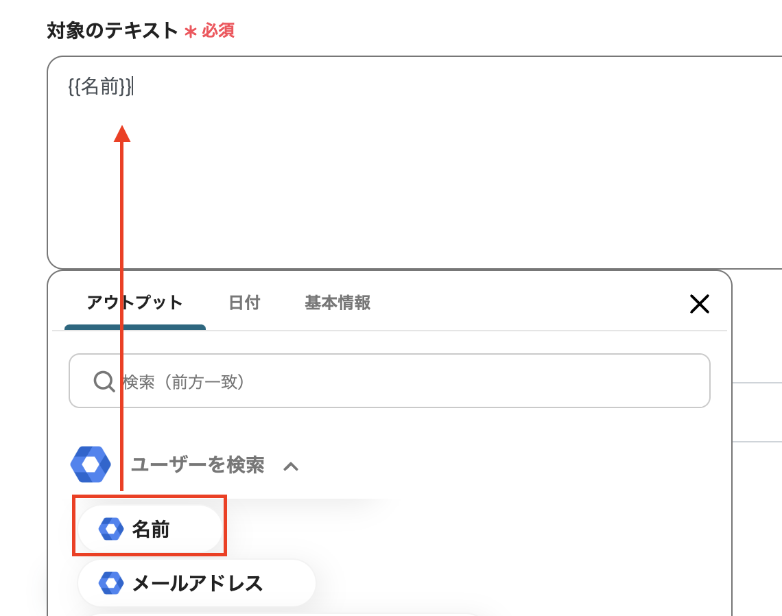(3)すでに『名前』が「対象のテキスト」として設定されていますが、以下画面のように「アウトプット」は状況に応じて任意で設定できます。