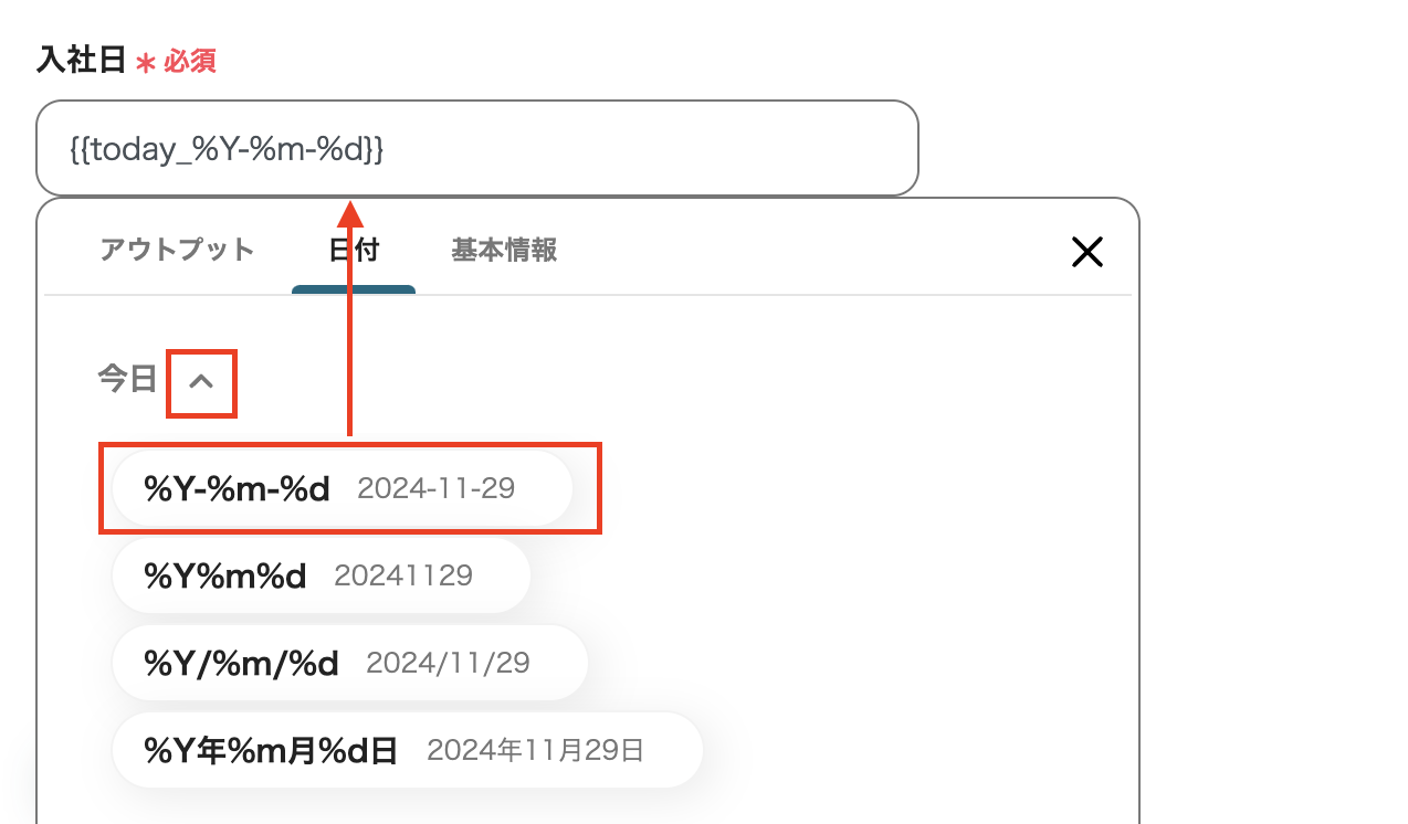 『今日』を入社日をして設定したい場合には、【日付】→『今日』の矢印をクリック→展開した情報のなかから任意のものを選択、という操作を行います。