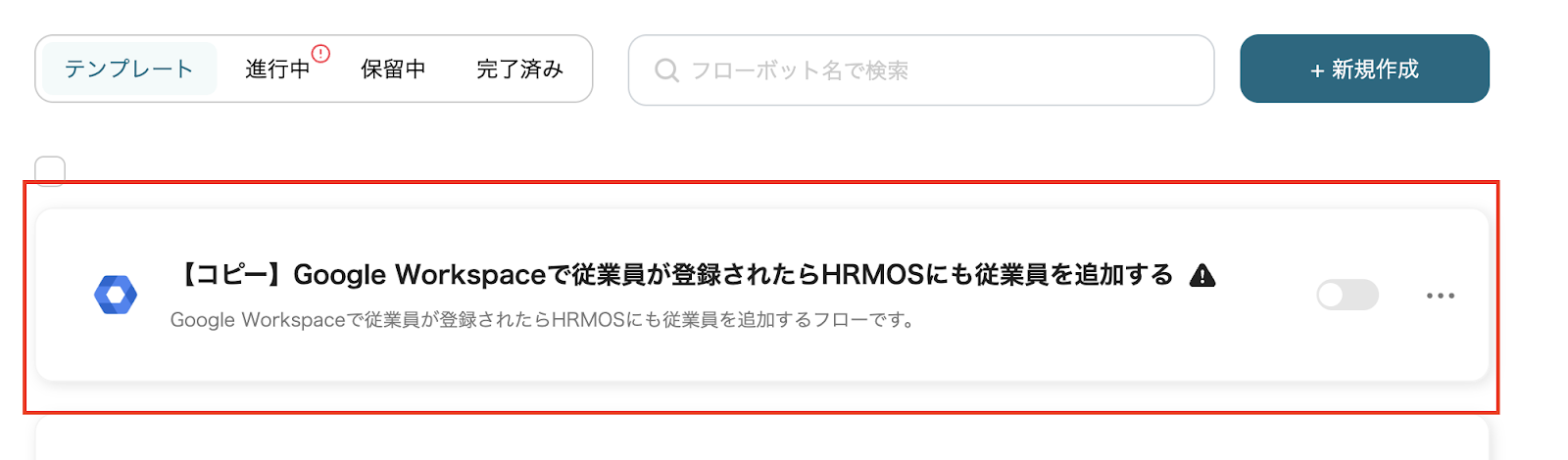 それでは、実際に「Google Workspaceで従業員が登録されたらHRMOSにも従業員を追加する」のテンプレートを使ったフローボットを作成していきましょう。