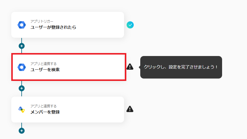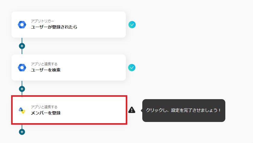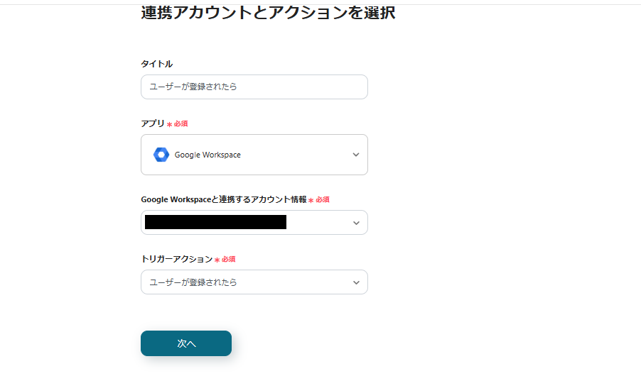 トリガーアクション:「ユーザーが登録されたら」を必ず選択してください。