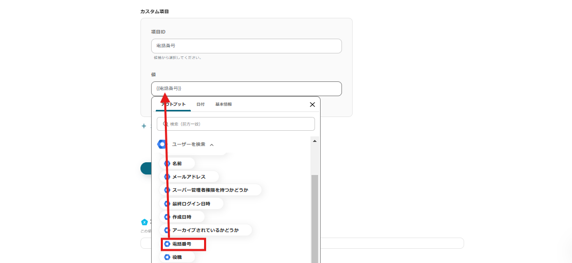 設定方法)ユーザー検索の中にある「電話番号」をクリックします。値に{{電話番号}}と表示されればOKです。