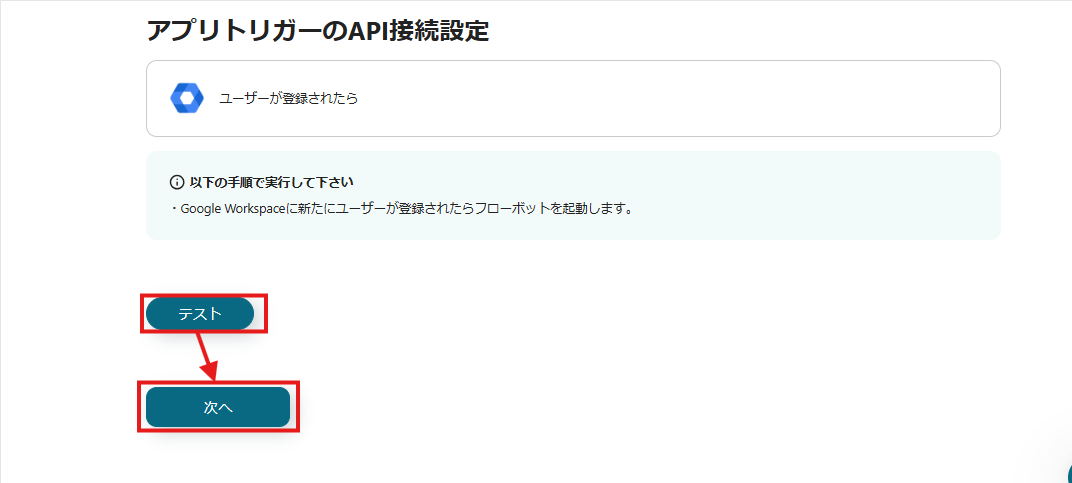 Google Workspaceにサンプルのユーザーを登録してから、テストをクリックします。