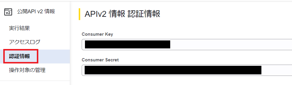 画面左のタブで「認証情報」を選択すると、Consumer KeyとConsumer Secretが表示されます。これらをBase64にエンコードしましょう。