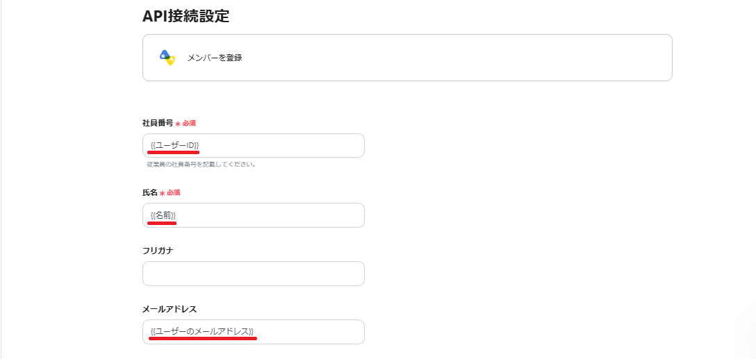 Google Workspaceにユーザーが登録されたら、カオナビのメンバーに自動で「社員番号」「氏名」「メールアドレス」が登録できるように設定されています。