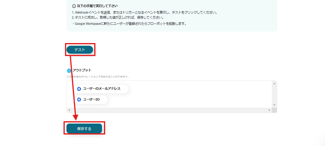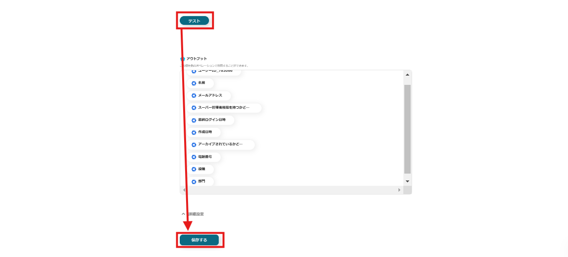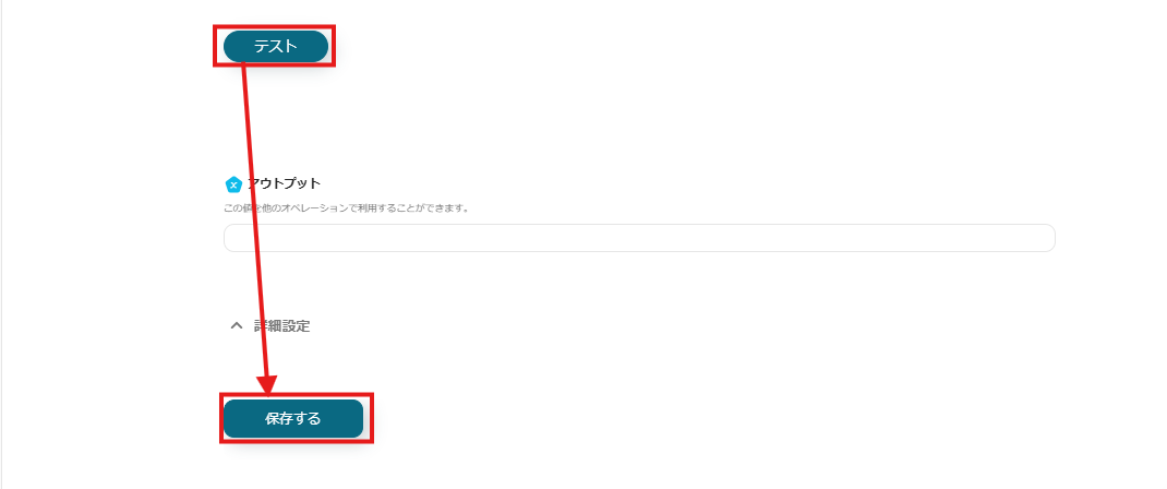 テストをクリックし、アウトプットが取得されたら保存しましょう。