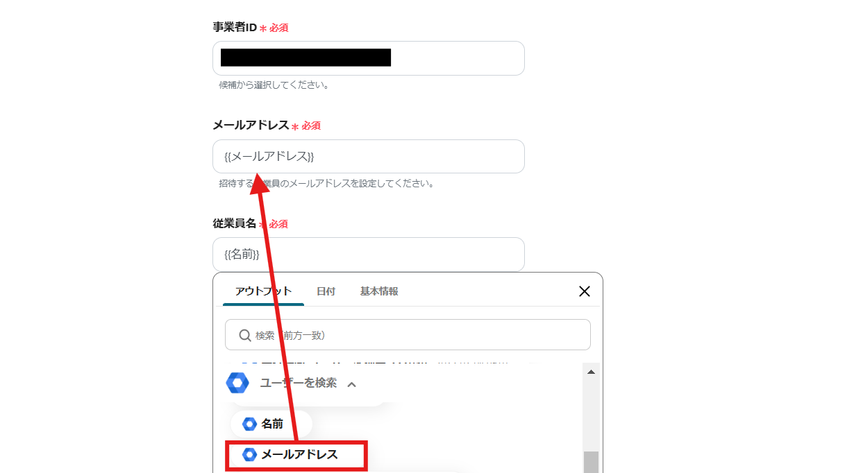 事業者IDは入力欄をクリックすると表示される候補の中から選択してくださいね。また、各項目は入力欄をクリックすると、以下の画面のようにGoogle Workspaceで取得した情報を引用できます。