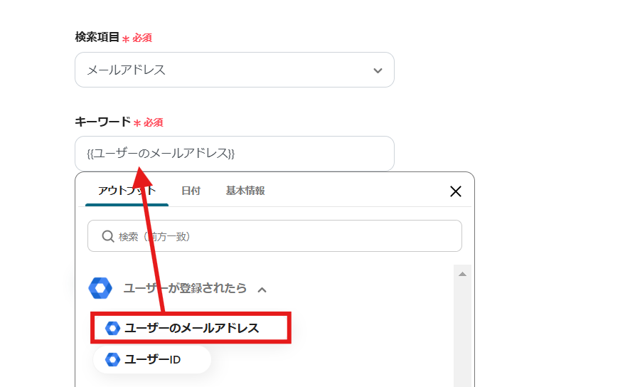 以下の画面だとメールアドレスで検索するよう設定しています。